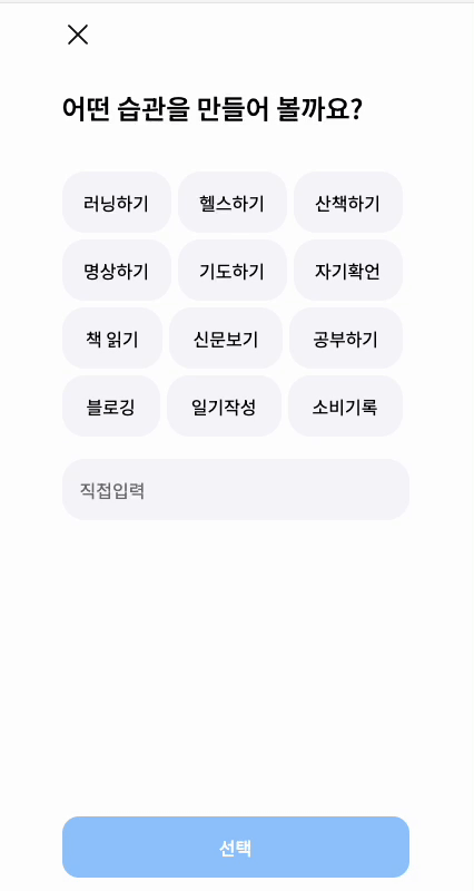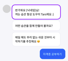 위의 사진처럼 기획에서 원하는건 메시지를 보여주고 "습관 선택"버튼을 누르면 "자격증 공부하기"라는 답변이 나온다.