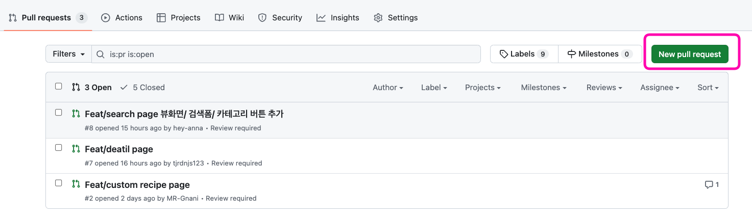 "New pull request"를 눌러서 PR을 생성해줍니다.