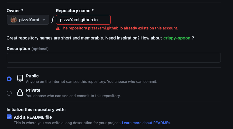 그런 다음 레파지토리 이름을 자신아이디.github.io로 설정하고 Add a README file을 체크해준다.