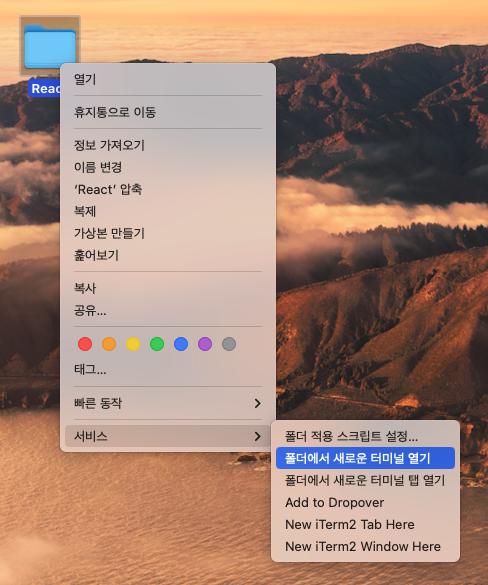 3. 우클릭 - 서비스 - 폴더에서 새로운 터미널 열기