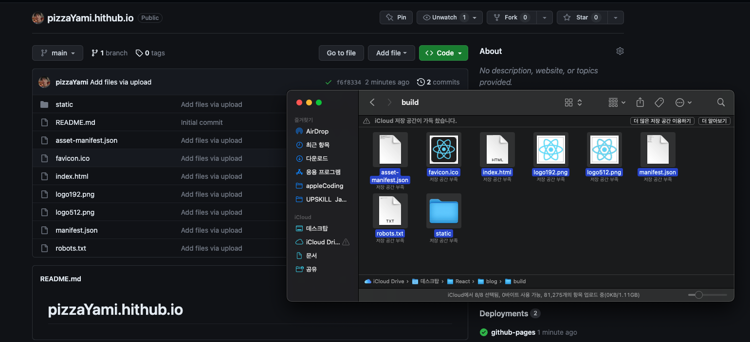 그럼 다음 build폴더안의 파일(build파일자체를 옮기면 안된다.)들을 드래그 앤 드롭으로 옮겨주고 초록버튼눌러주면 끝!!