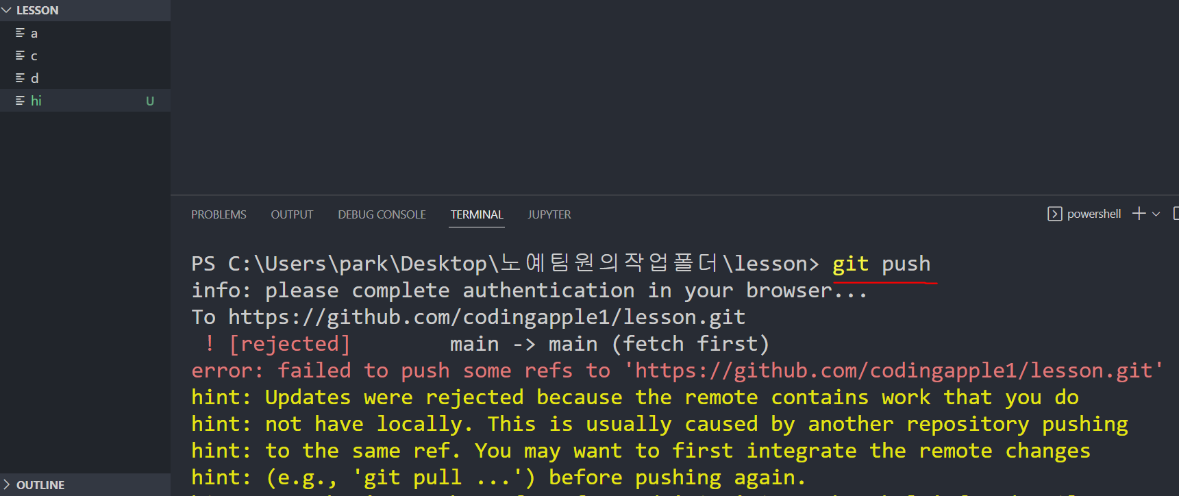 나는 저 사실을 모르고 hi라는 파일을 만들고 push하려고하면