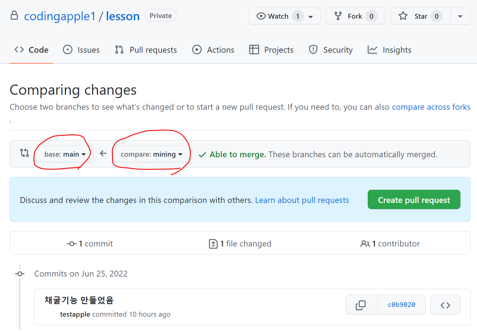 초록버튼 누르면 pull request가 열린다.