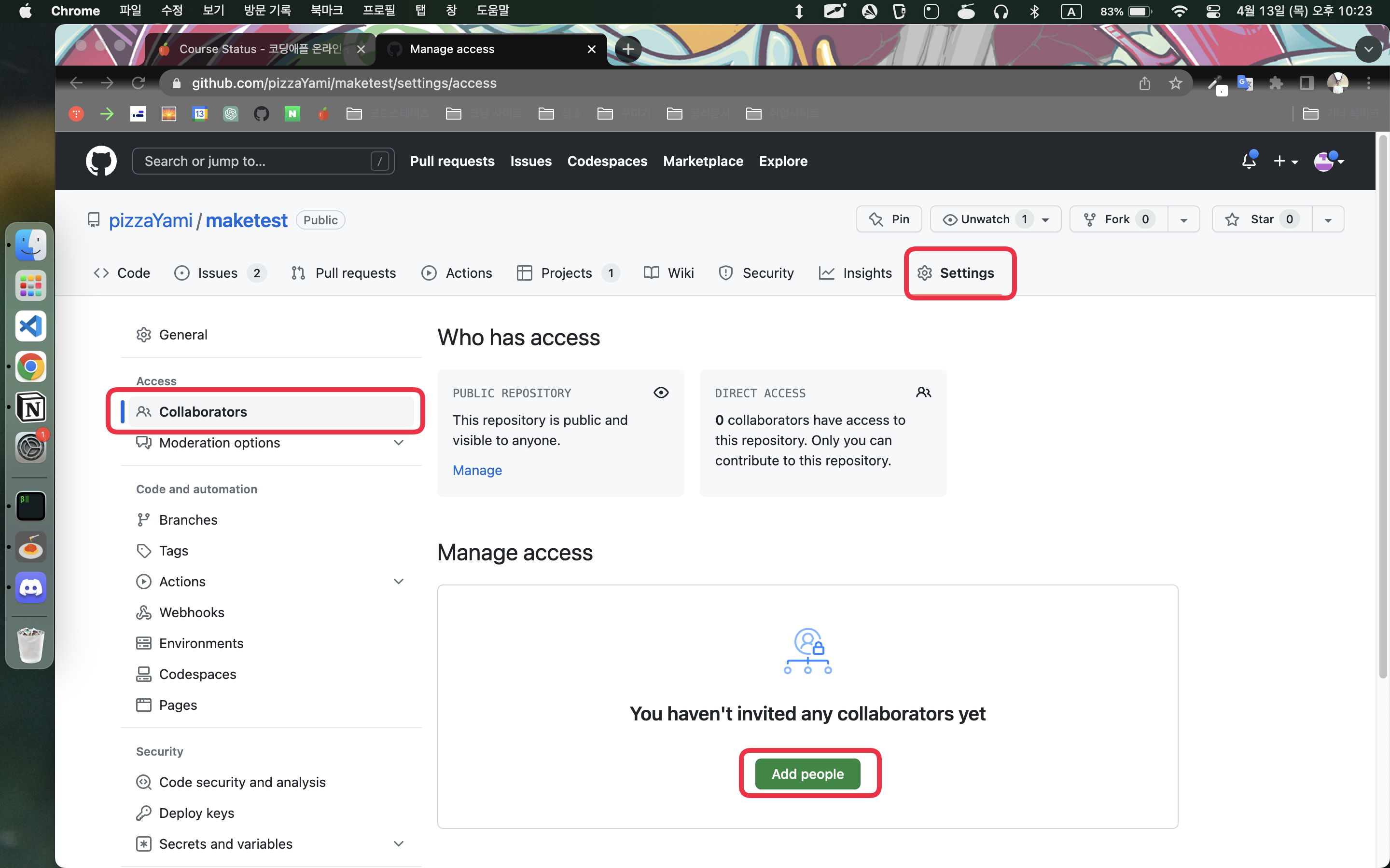 그 팀원의 아이디를 Collaborators 메뉴에 등록해놔야한다.