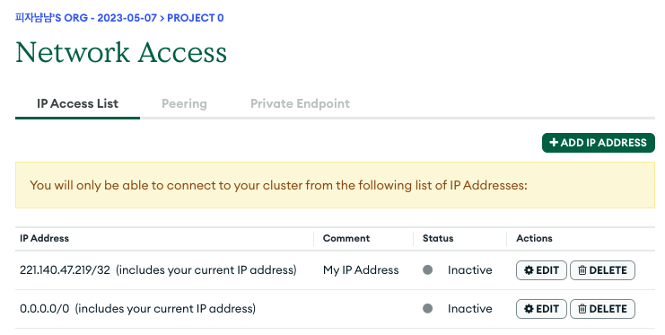 3. Network Access에서 Allow access from anywhere을 누르시거나 0.0.0.0/0 을 추가합니다.