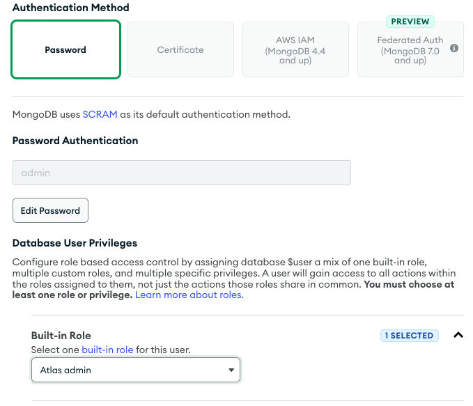 built-in Role에서 Atlas admin으로 역할 변경 (그 아이디로 DB접속시 다 할 수 있다.)