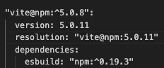 yarn.lock 파일에서 vite의 dependencies 목록 중 esbuild의 버전이 0.15.15보다 작다면 0.15.15보다 높은 버전으로 수정 후 yarn install하기